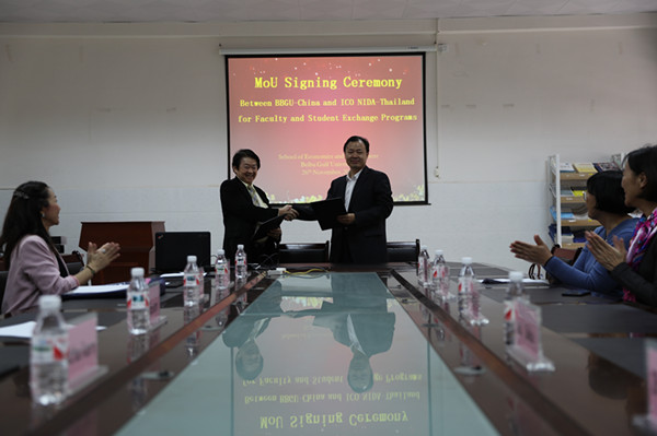 11月26日,泰国国立发展管理学院国际学院院长皮博恩•普瑞维斯一行六人到经济管理学院交流并签订战略合作协议。经管学院院长朱芳阳主持交流会。朱芳阳表示,为解决在“不忘初心、牢记使命”主题教育中教职工提出的加强教职工在职提升的问题,决定和泰国国立发展管理学院国际学院开展博士班教育合作,近期将选拔首批教职工单独成博士班学习。协议还就双方的合作交流,学生交换和教师交流达成广泛共识。朱芳阳和皮博恩•普瑞维斯...