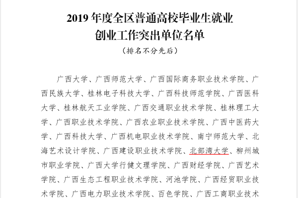 根据《自治区教育厅关于公布2019年度全区高校毕业生就业创业工作突出单位名单的通知》(桂教学生〔2019〕17号),pp电子再次被评为2019年度全区高校毕业生就业创业工作突出单位。近年来,pp电子就业创业工作始终践行以提高学生的就业质量为核心、以满足学生切身需求为重心、以学生的成长为中心的“三心”服务模式,秉承以全程的高度,把握就业指导的科学性,以全线的深度,提升就业指导的精准性,以全域的宽度,确保就业指导的全面...
