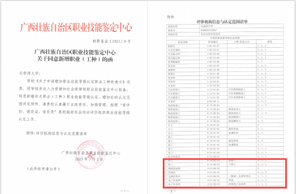 近日,自治区职业技能鉴定中心批复同意pp电子新增12个职业(17个工种)的职业技能等级认定资质,pp电子职业技能鉴定所,在职业技能等级认定范围获得新突破。pp电子职业技能鉴定所在稳步开展职业技能认定工作基础上,不断创新拓展力争突破。自2020年以来,开展高校毕业生职业技能培训并获相关工种等级证2861人;2021年5月,pp模拟器游戏官网入口职业技能鉴定所获批第三方认定机构,拥有等级认定资质和专项职业能力认定资质;2023年3月1日,又获批12个项目不同方向的工种认定,...