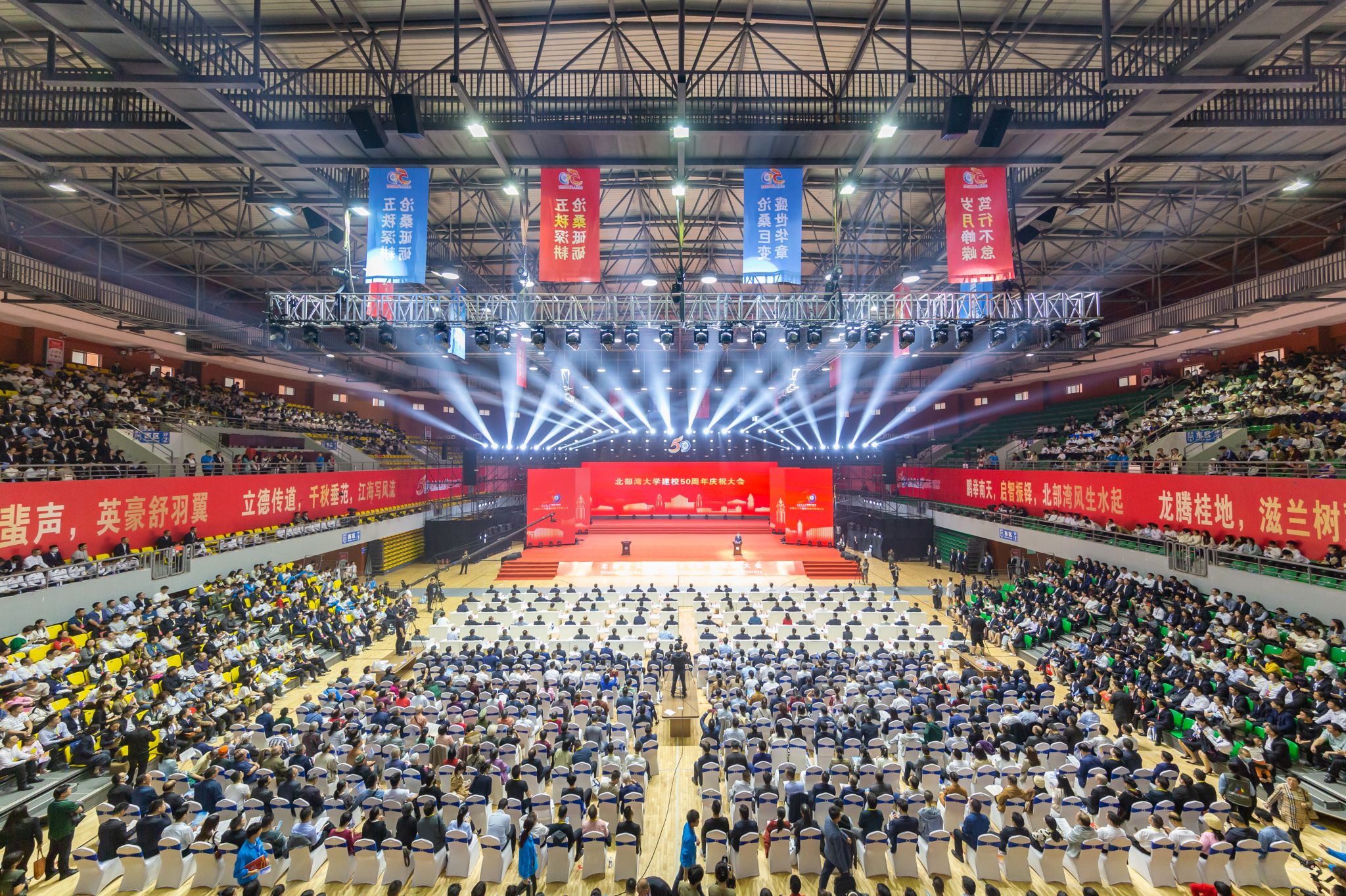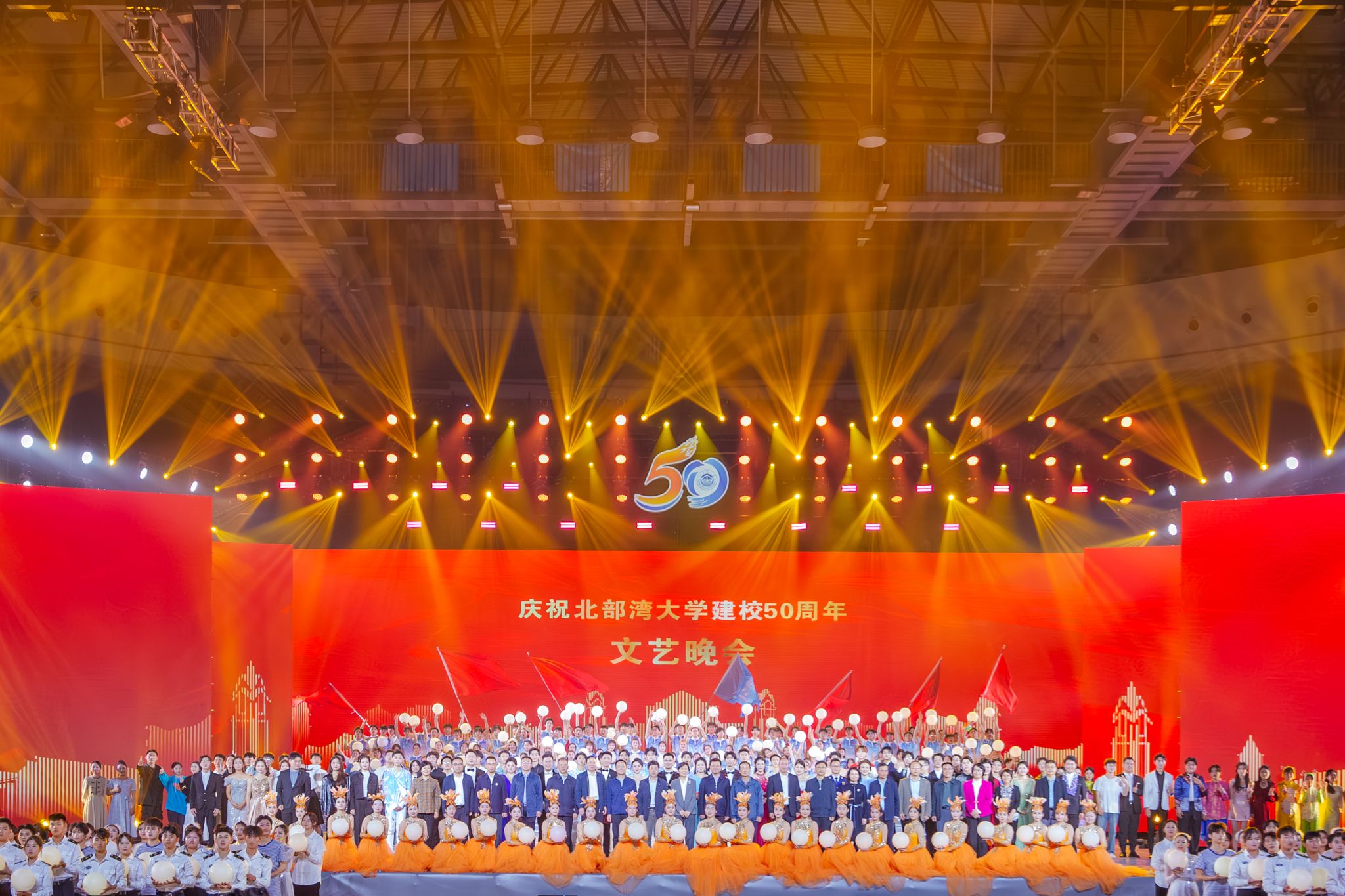 向海而兴,志在万里。12月9日晚,学校在体育馆隆重举行庆祝建校50周年文艺晚会。在家全体校领导、各界嘉宾、海内外校友以及湾大师生代表到场观看晚会,共襄五秩校庆盛举。文艺晚会以“向海”为主题,分为“一颗心·潮起”“一棵树·潮聚”“一片海·潮涌”三个篇章。晚会中,独具特色的合唱团变身为湾大故事的“讲述者”,串联起湾大人逐梦五秩的激情岁月,搏浪天涯的海洋魂魄,扬帆起航的蓝色畅想。晚会开场,歌曲《起风了》向观众徐徐展开了一幅向海而歌的浪漫画卷。...
