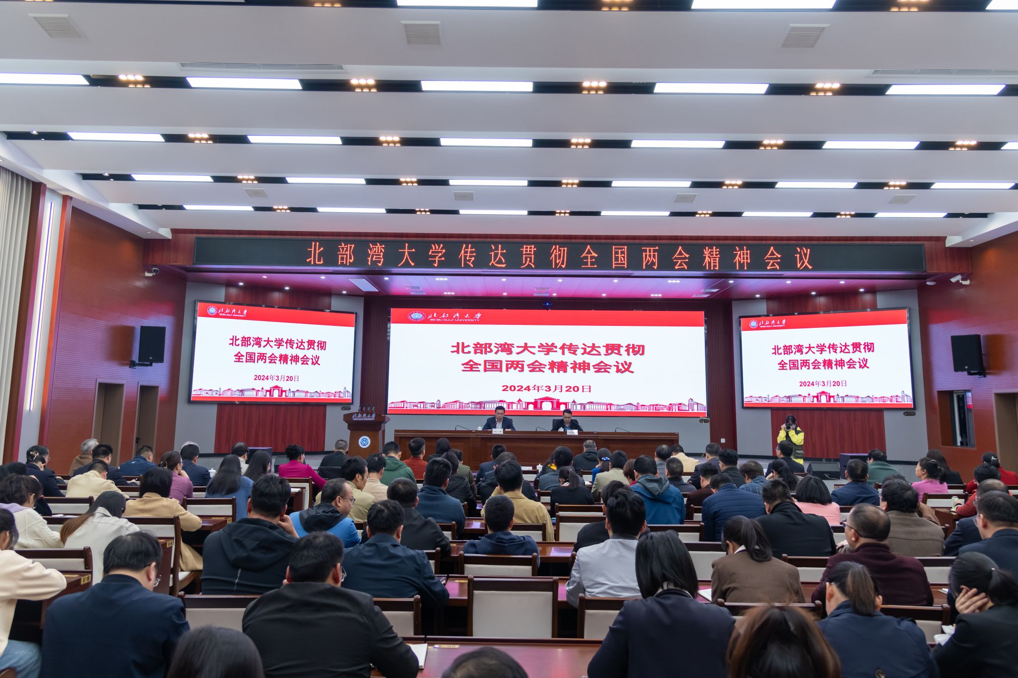 3月20日,学校在办公楼一楼报告厅召开会议,传达贯彻全国两会精神。全体在钦校领导出席会议,校党委副书记陈磊主持。全国人大代表、副校长尹艳镇领学了习近平总书记有关重要讲话和全国两会精神,并结合学校发展重点任务部署全国两会精神的落实工作。他汇报了在全国两会期间履职尽责的基本情况,并就学校下一步如何贯彻落实两会精神详谈了感受和思考。他表示,不管是教育教学还是科研创新,全校师生都要自觉用习近平新时代中国特色社会主义思想推动工作,...