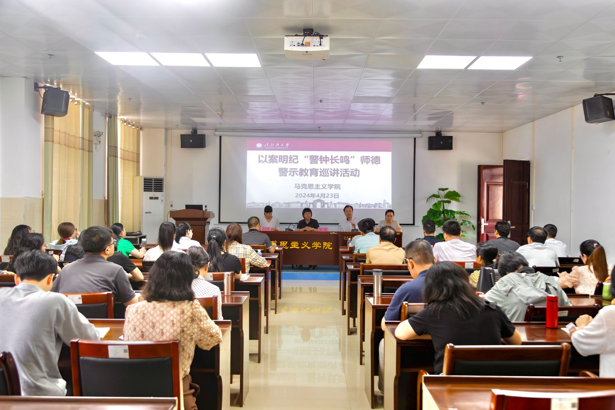 4月23日下午,校党委常委、副校长陆衡带队先后到马克思主义学院、教育学院开展以案明纪“警钟长鸣”师德警示教育巡讲活动。党委教师工作部部长朱芳阳主持。会上,党委教师工作部副部长邓宗莲通过剖析学校师德师风违规案例,提醒广大教师以案为鉴、以案明纪,做到警钟长鸣。陆衡强调,各学院要强化党建引领,建强教师党支部,使教师党支部成为涵养师德师风的重要平台;强化师德日常教育,提升教师思想政治素养和职业道德水平,贯彻落实师德师风第一标准;...