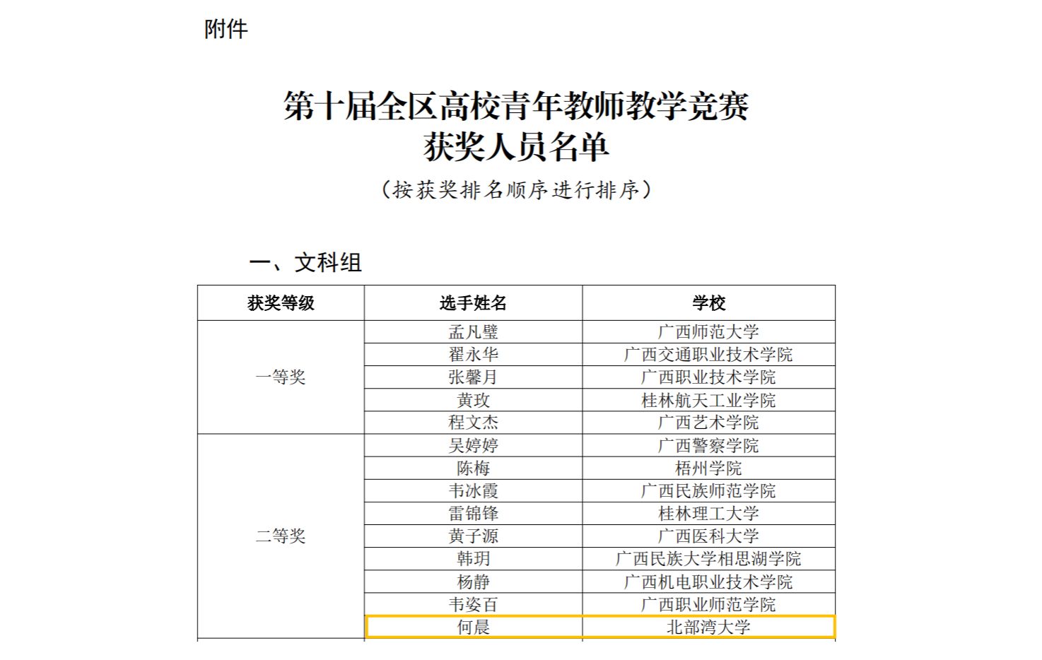 近日,第十届全区高校青年教师教学竞赛获奖名单正式公布,pp电子共有四名教师获奖。其中人文学院何晨老师荣获文科组二等奖,理学院欧玉芹老师荣获理科组三等奖,建筑工程学院张蕾蕾老师荣获工科组三等奖,马克思主义学院颜文娟老师荣获思政组三等奖。第十届广西高校青年教师教学竞赛决赛由广西壮族自治区教育厅、广西壮族自治区总工会主办,广西师范大学承办,来自全区58所高校的134名选手参赛。初赛阶段,全区75所高校259名教师参赛。...