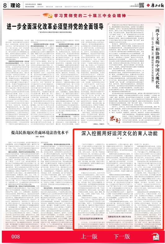 8月8日,《广西日报》第8版理论专栏刊发pp电子党委副书记陈磊理论文章《深入挖掘用好运河文化的育人功能》。文章从“深刻理解运河文化的内涵和意义”“充分认识运河文化的教育价值”“创新运河文化育人模式与方法”三方面阐述。文章认为,地方高校应以平陆运河等运河文化资源为依托,深入挖掘运河文化的育人功能,把握运河文化与思想政治教育的契合点,把运河文化融入教材、融入课堂、融入实践,助推文化育人工作的高质量发展,培养好中国特色社会主义事业的建设者和接班人。...