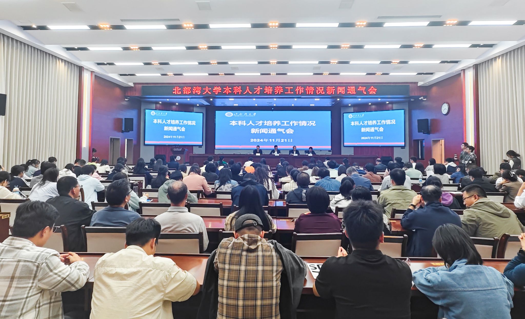 11月21日下午,学校在办公楼一楼报告厅举办了“本科人才培养工作情况”新闻通气会。会议由校党委副书记、学校新闻发言人陈磊主持,副校长尹艳镇、教务处处长王柏玲、学生工作部(处)部(处)长郑德威出席并发布相关信息。会上,尹艳镇详细介绍了学校在人才培养方案修订、“三全育人”综合改革、学生实践能力培养、师资队伍建设、教学信息化建设、制度建设等方面的工作进展。他表示,学校始终围绕立德树人根本任务,将进一步全面深化人才培养体制机制改革,...