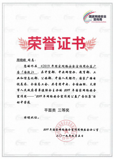 近日,由中央宣传部、中央网信办、教育部、工业和信息化部、公安部、中国人民银行、国家广播电视总局、全国总工会、共青团中央、全国妇联等部门联合举办的2019年国家网络安全宣传周公益广告设计大赛评选结果新闻发布会在天津召开。pp电子陶瓷与设计学院周晓峰教授的公益广告海报作品获得“三等奖”。据悉,本次宣传周公益广告公开征集活动历时1个月时间,面向全国征集以“网络安全为人民、网络安全靠人民”为主题的原创设计作品,...