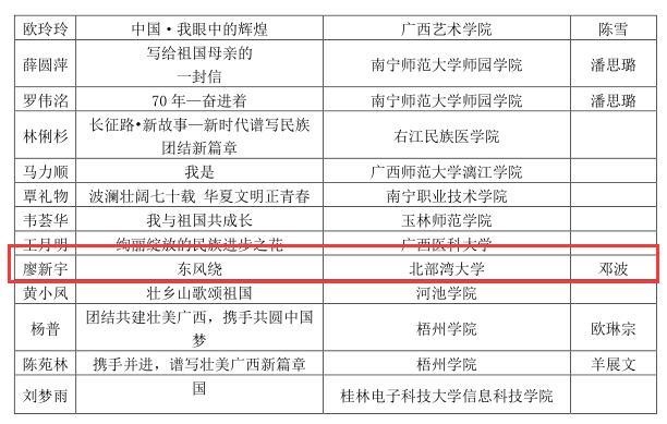 近日,根据桂教民教[2019]11号文件《自治区教育厅关于公布“喜迎新中国成立70周年 共话民族团结进步教育”征文活动评选结果的通知》获知,由党委宣传部邓波老师指导廖新宇创作的作品《东风绕》荣获高校组二等奖;党委宣传部陈烜严老师指导罗茵创作的作品《盛世盛景迎国庆大美中国新征途》荣获高校组三等奖。pp电子对此次征文活动高度重视,从5月份开始发征文通知,面向全校征集征文作品,9月汇集作品,集中挑选优秀作品4篇报送至...