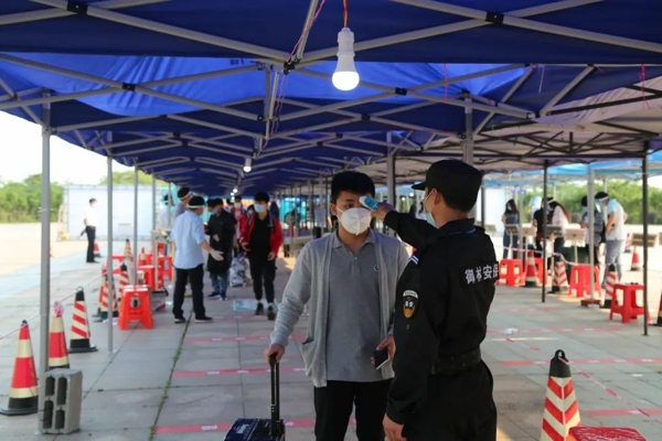 在安保人员与老师的引导下,首批返校的毕业生整齐有序走向检测通道,扫码进入校园后或步行或乘坐校园交通车回到宿舍。