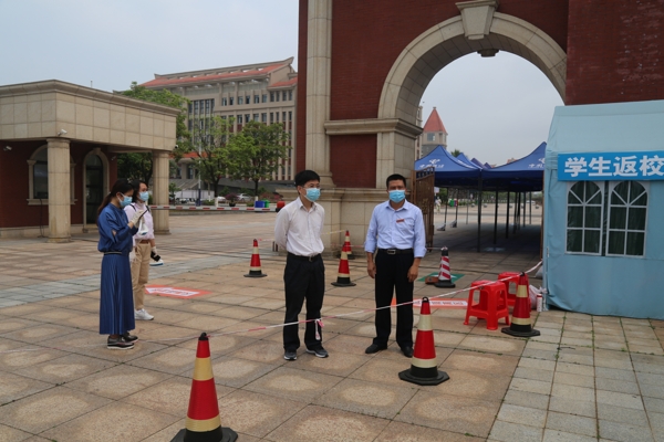 为迎接学生安全返校,学校共组织了两次全校性的应急演练。当天上午八点,学校领导提前到南门对准备工作进行检查。