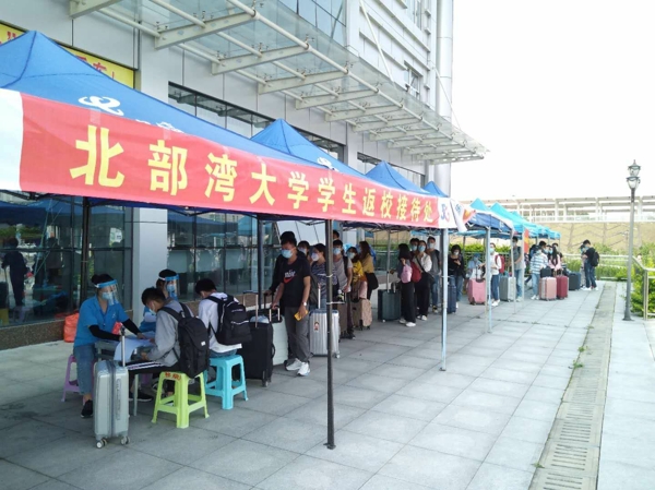4月20日早上9时许,从钦州东站乘专车返校的第一批湾大毕业生30多人抵达南门。