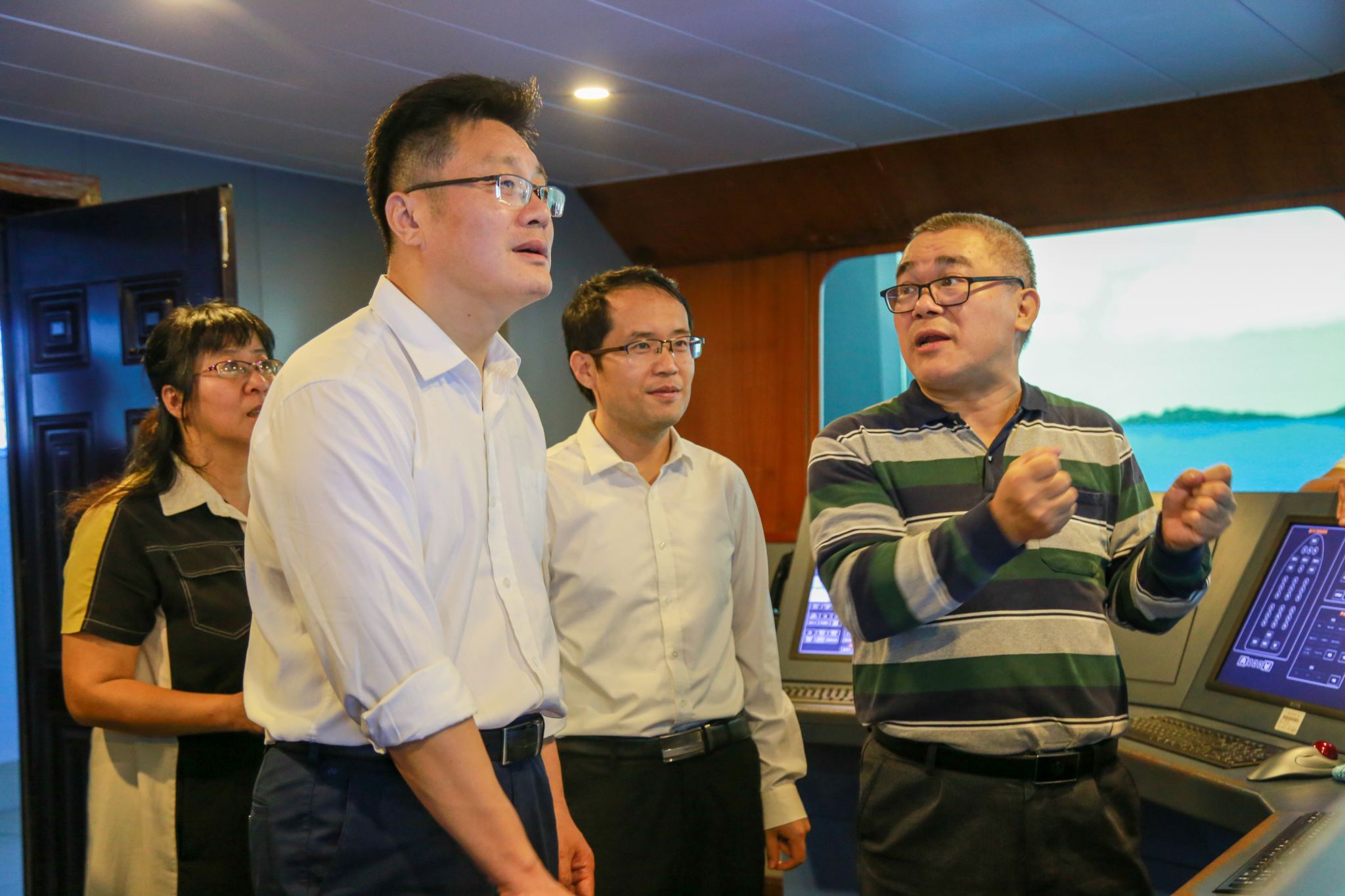 于朝运副司长(右3)实地调研海运学院航海模拟实验室