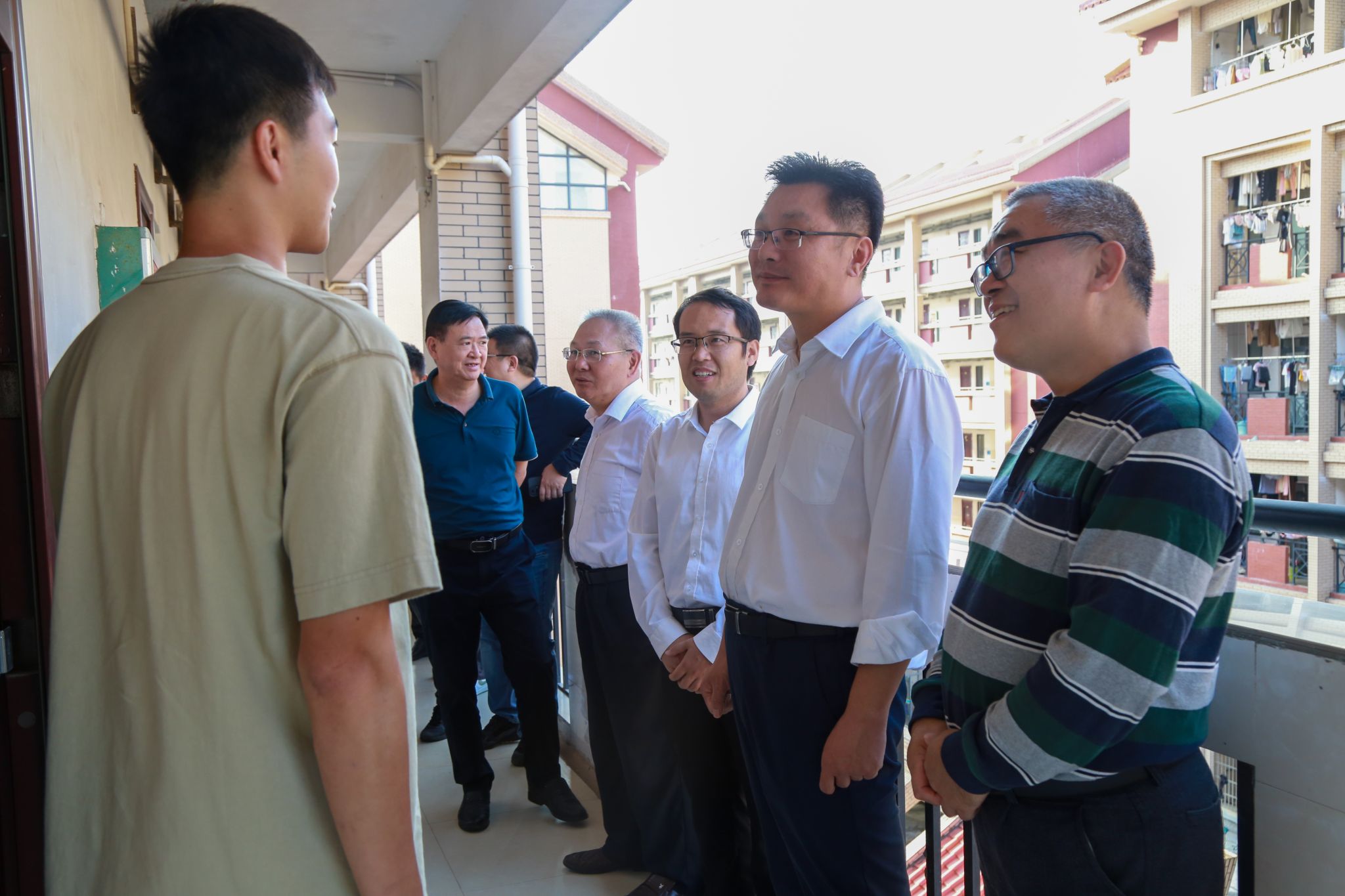 于朝运副司长(右2)到退役学生宿舍,详细了解退役学生的学习生活情况