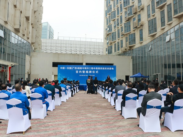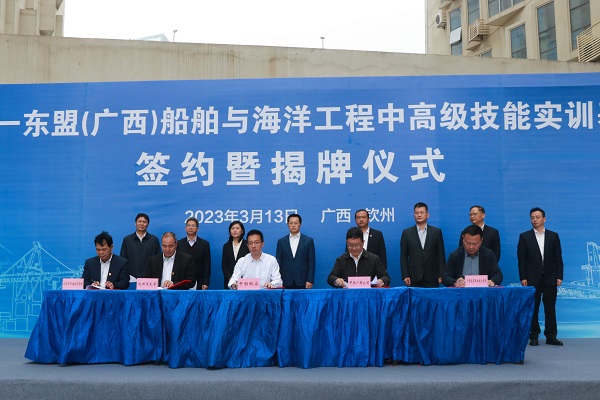 3月13日,在全国两会胜利闭幕之际,中国—东盟(广西)船舶与海洋工程中高级技能实训基地签约暨揭牌仪式在钦州港片区举行。仪式由钦州港片区管委副主任莫福文主持。pp电子党委常委、副校长唐高华受邀参加仪式。