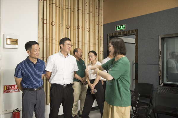 黎攀(左二)一行实地考察学校全媒体实训教学中心、网络传播实训室以及虚拟演播室