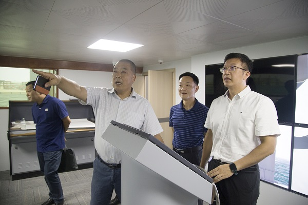 黎攀(右一)实地考察学校航海虚拟仿真实验实训中心