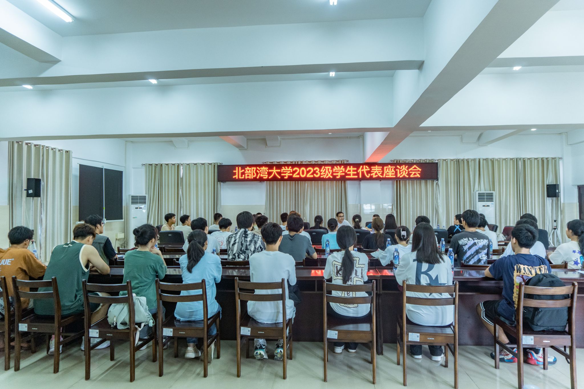 9月22日,学校在办公楼501会议室召开2023级学生代表座谈会。校党委书记韩峻峰看望慰问学生代表。会议由校党委常委、副校长马秀明主持。校学工处处长、党委宣传部常务副部长裴以明以及来自学校16个学院的40名同学参加座谈会。