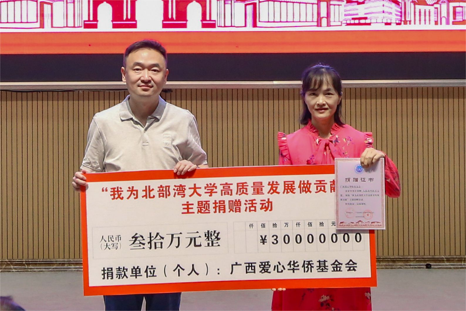 苗剑校长向广西华侨爱心基金会代表唐瑜女士颁发捐赠证书