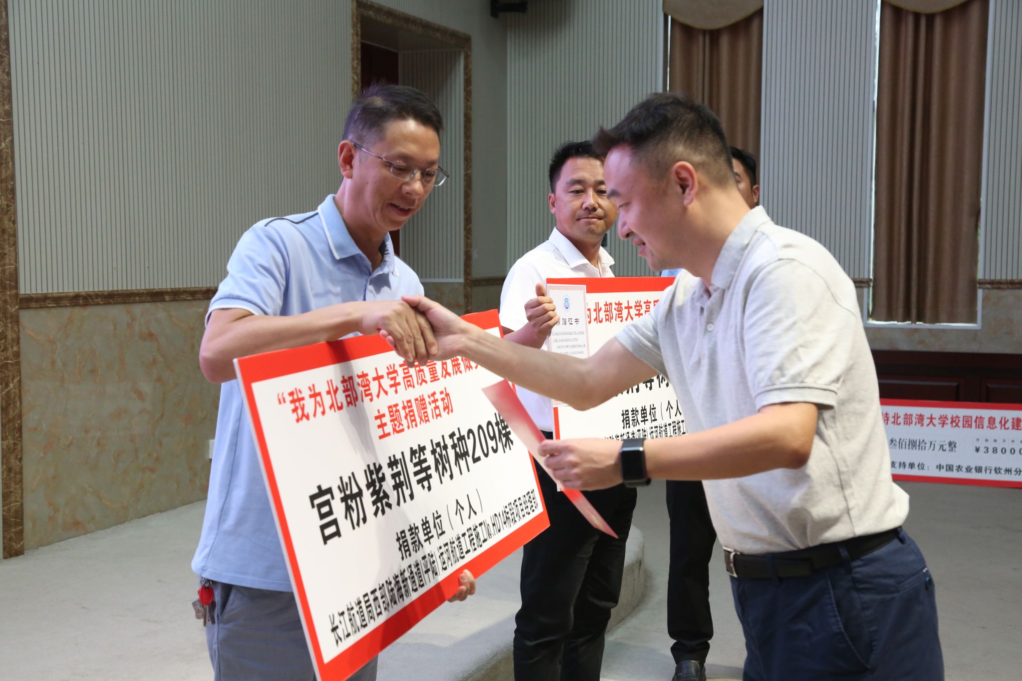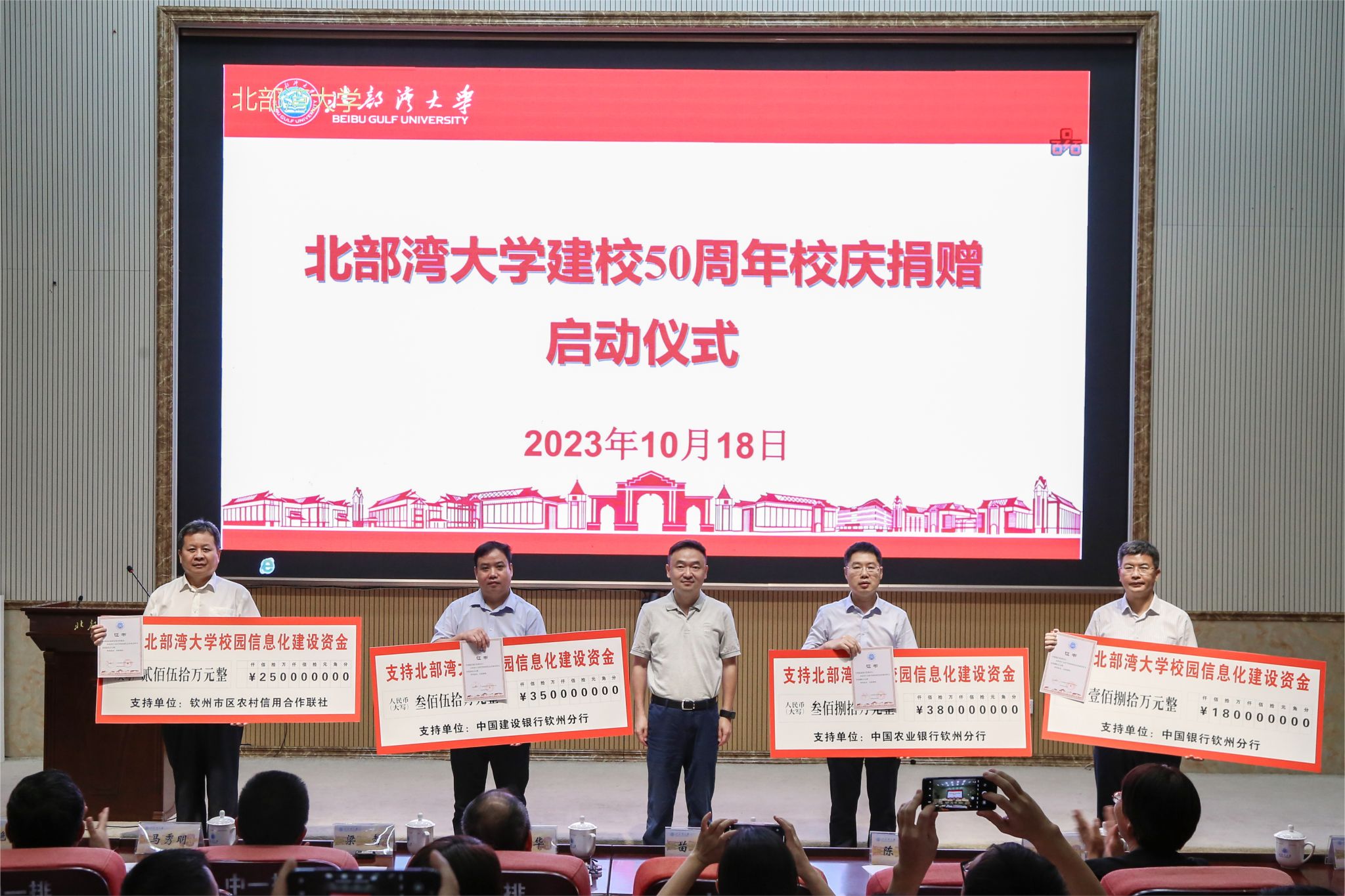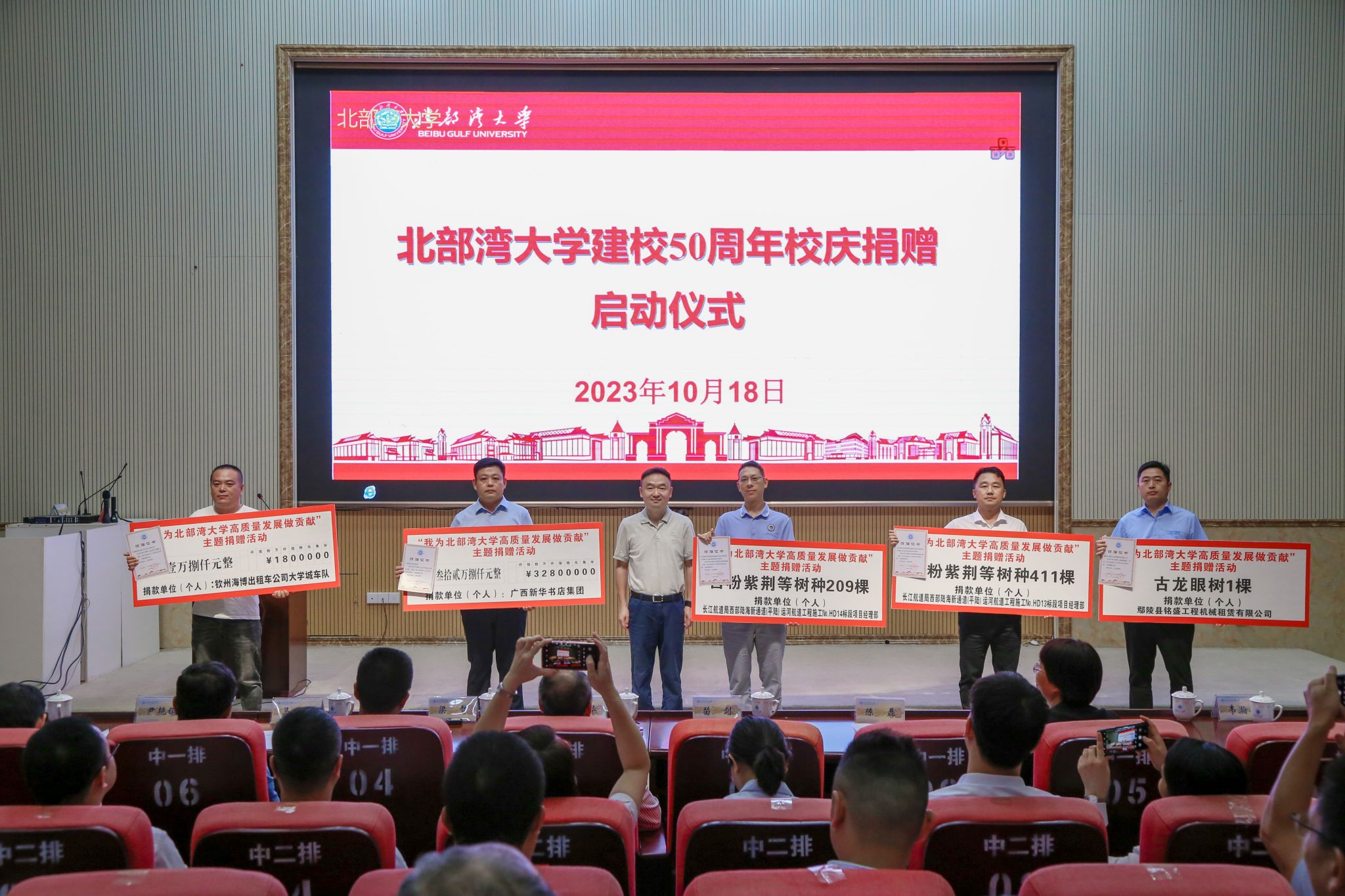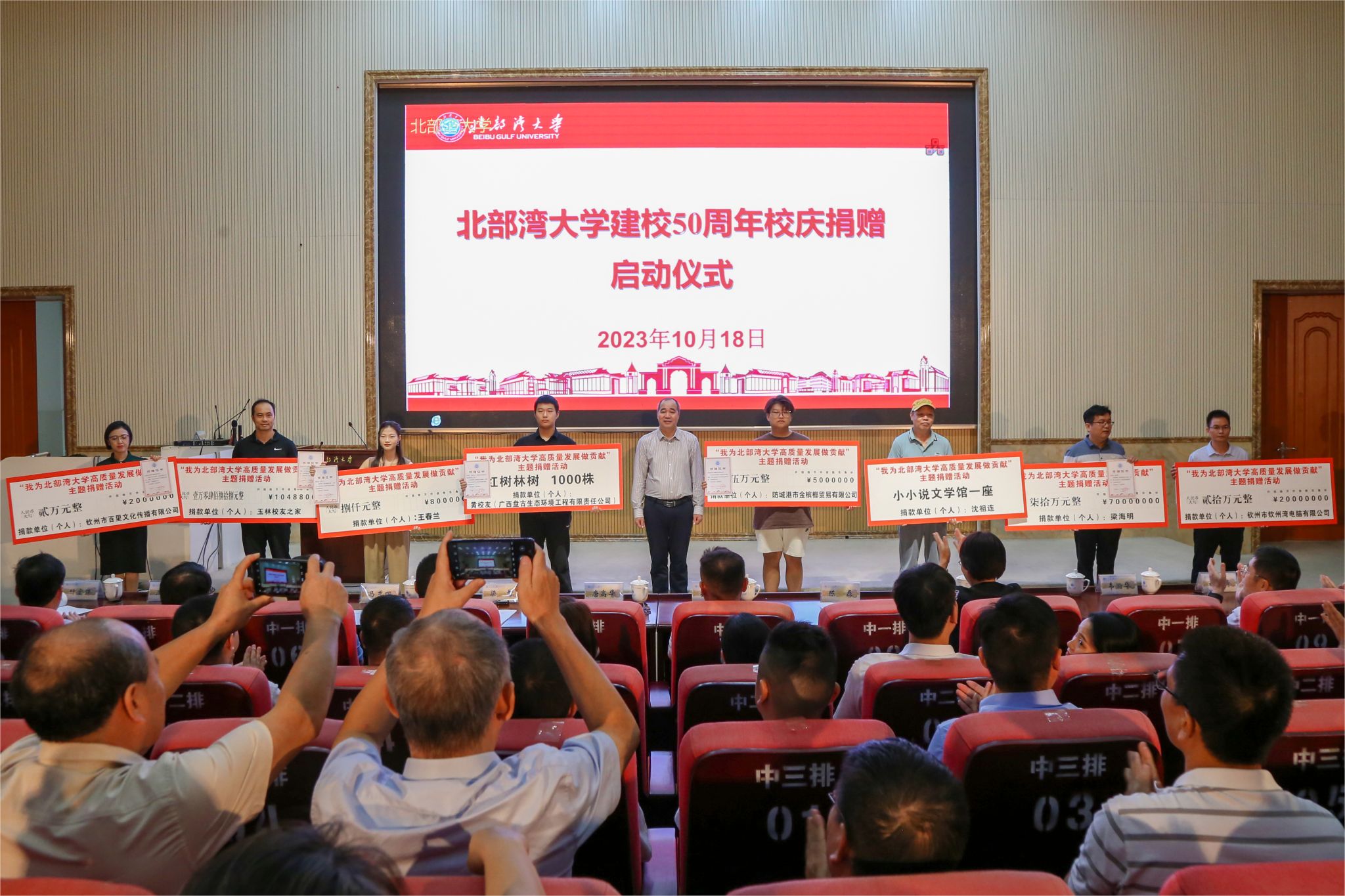 捐赠启动仪式上,校友梁海明、胡忠旗、刘浩彰、黄海东、江世区、王春兰,玉林市校友之家、广西华侨爱心基金会、钦州海博出租车公司大学城车队、苏世建设管理集团有限公司广西钦州分公司,以及学校部分教职工代表共计捐赠现金约160万元人民币;校友沈祖连捐建小小说文学馆一座;合作企业中国农业银行钦州分行、中国建设银行钦州分行、中国银行钦州分行、钦州市区农村信用合作联社、广西新华书店集团传文大中专教材公司等爱心企业共支持学校信息化建设和改善办学条件建设经费1192.8万元;长江航道局西部陆海新通道(平陆)运河航道工程施工№.HD13标段项目经理部、长江航道局西部陆海新通道(平陆)运河航道工程施工№.HD14标段项目部、鄢陵县铭盛工程机械租赁有限公司等捐赠各种树木621棵。校友黄本扬及其企业广西盘古生态环境工程有限责任公司捐赠红树林树苗1000株。
