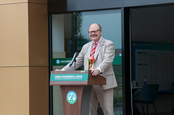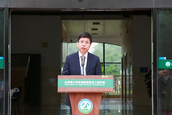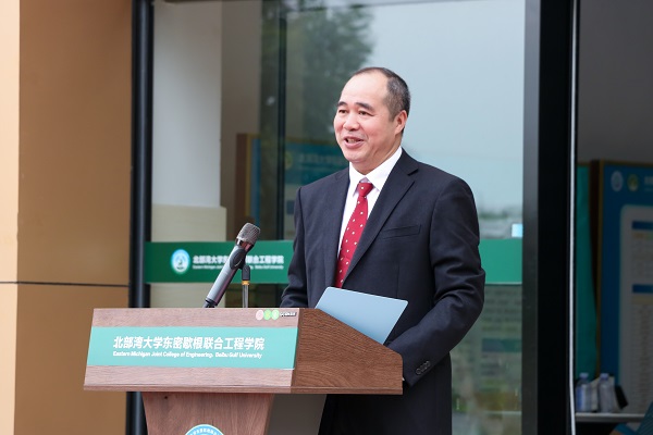 当天,美国东密歇根大学校长Smith、国际关系发展主任Connie Ruhl-Smith、工程技术学院院长Mohammad Qatu、国际合作项目主任Eva Blank一行与学校党委书记韩峻峰、自治区教育厅对外合作与交流处一级调研员吕青共同出席了联合工程学院标志性建筑揭牌仪式。校党委常委、副校长、联合工程学院院长唐高华主持仪式。
