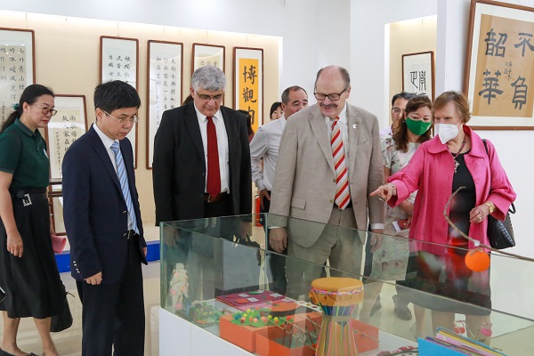 Smith校长(左二)一行在学校教育学院观看学生手工作品