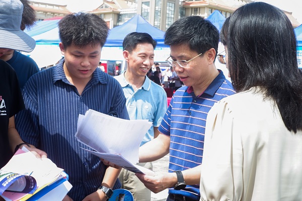 学校党委书记韩峻峰、钦州市人力资源和社会保障局局长黄宗旺、副局长陈建统到现场与用人单位深入交流,了解用人单位需求情况及毕业生求职应聘情况,鼓励毕业生抓住双选会的机会先就业再择业。