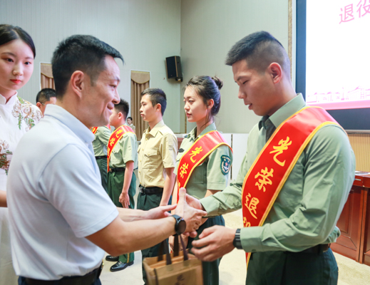 与会领导们为同学们一一戴上“光荣退伍”绶带,并送上复学纪念品。