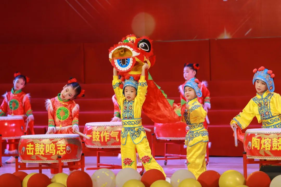 鼓声、笑脸、彩带、萌娃……湾大附属幼儿园的开场舞蹈《萌娃欢庆二十大》瞬间燃爆全场。