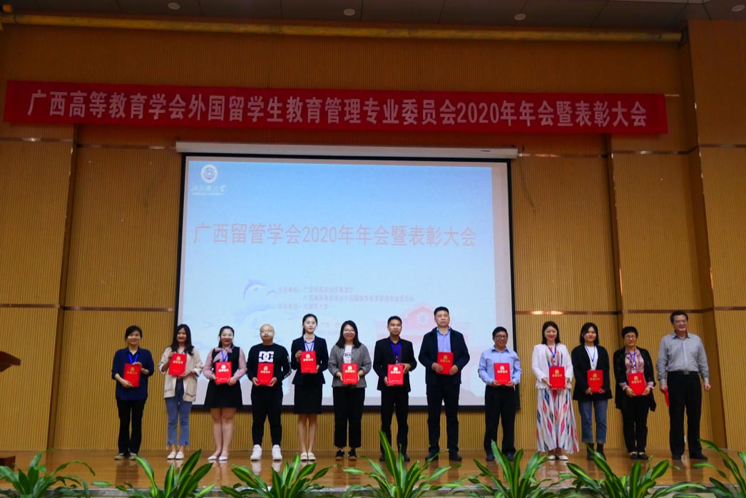 大会还进行了表彰。pp电子覃斯、林学艺、韦露美、苏若辞4位老师获2019-2020年度广西高校来华留学教育优秀个人,pp电子再获广西高校来华留学教育优秀单位。
