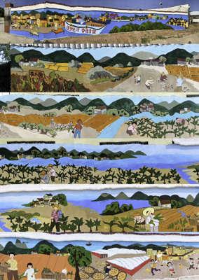 经过调研分析,一幅平陆运河山水长卷的形象清晰地呈现在大家的脑海中。志愿者团队在带队老师的指导下集思广益,设计出了平陆运河船只运输场面、人民业余生活休闲娱乐场面、青苏村特色产业——中药材莪术的种植与收获场面的三个场景,以流淌不息的平陆运河贯穿衔接,体现运河造福于民的景象。