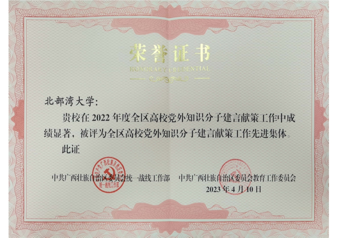 全区高校党外知识分子建言献策工作先进集体荣誉证书