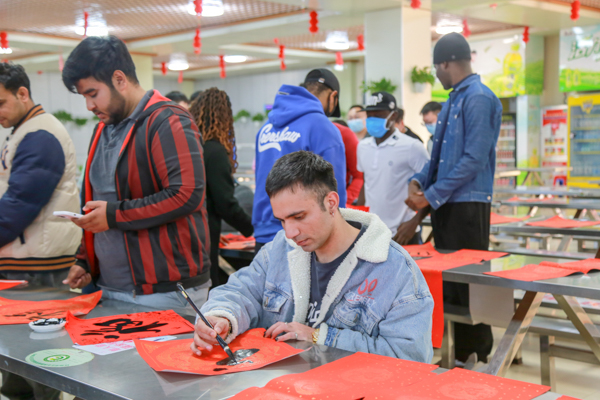 餐厅另一边,铺展红纸,挥毫泼墨,在中国教师的讲解、示范下,外籍师生纷纷拿起毛笔,沾上浓浓的墨汁,在红纸上兴致勃勃地摹写对联和“福”字,一个个充满趣味和欢乐的“福”字在大家笔下妙趣横生,也成为了中外师生心心相通的纽带。