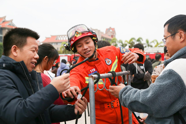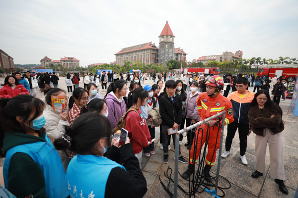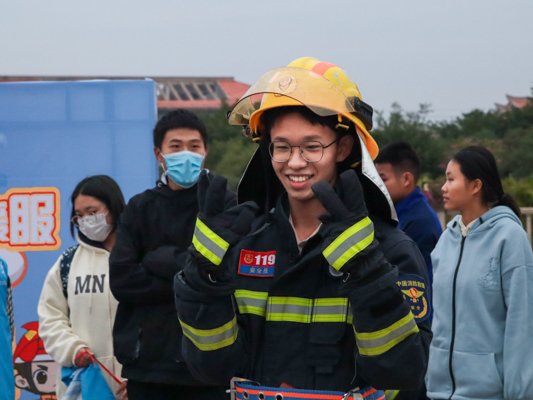 “看消防员使用消防水带很轻松,没想到这么重。”在消防水带保龄球项目体验中,同学们不禁感慨道,看似简单的消防救援技能背后藏着无数次刻苦训练;现场穿戴厚重的灭火战斗服,让大家亲身体验了消防救援人员在执行任务时的速度与力量;操作消防绳等环节让师生们在亲身实践中进一步掌握消防器材的正确使用方法;可爱的消防人偶则吸引了大家进行亲密互动,气氛热烈。消防救援支队还为现场的观众们精心准备了具有消防元素的宣传产品,让大家在收获消防安全知识的同时收获小惊喜。