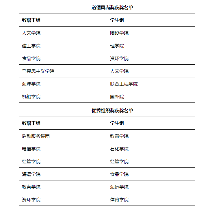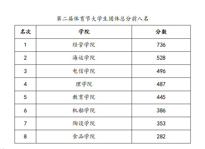 本届体育节总裁判长、体育学院院长李乃琼宣布运动会团体获奖结果。第二届体育节大学生组共有8个大项,53个小项目。与会领导为获得道德风尚奖、优秀组织奖,校运会教工组团体总分前八名、校运会学生组团体总分前八名、体育节大学生团体总分前八名进行颁奖。
