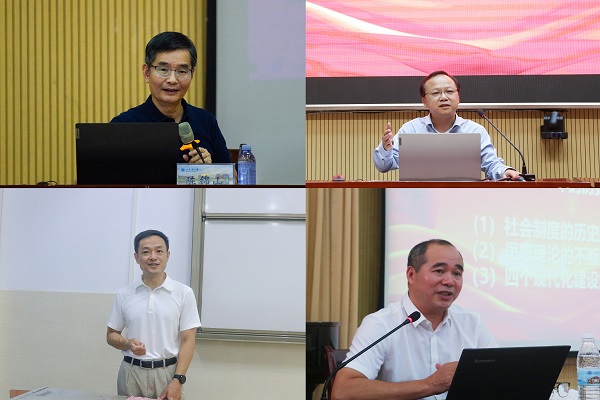 学校党委副书记陈锦山(左上)、陈湘如(左下)分别为教育学院、海运学院和机船学院的同学讲授形势与政策课;