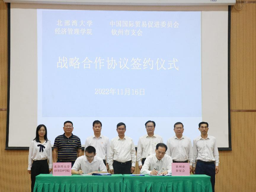 11月16日,学校经济管理学院与钦州市贸促会在4号教学楼101报告厅签订战略框架合作协议。学校党委副书记陈锦山、钦州市贸促会党组书记、会长黄应增出席并见证签约仪式。