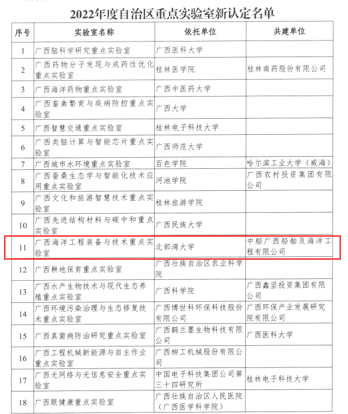 近日,自治区科技厅公布2022年度自治区重点实验室新认定名单,学校“广西海洋工程装备与技术重点实验室”成功获批,成为此次新增认定的18家自治区重点实验室之一,标志着pp电子在船舶与海洋工程研究领域科研能力和水平迈上一个新台阶。