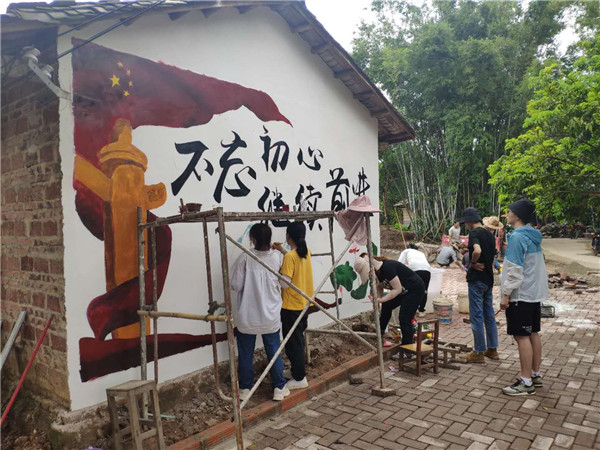 学院相关负责人表示,学院自开展党史学习教育以来,坚持把党史学习教育和助力乡村振兴紧密结合,积极鼓励师生将学习成果和专业知识转化为为民办实事的内生动力,为建设宜居宜业的现代化乡村贡献力量。学院多次组织师生到定点扶贫村、街道社区,围绕乡村振兴和“卫生城市、文明社区、绿水青山”等主题开展“文化墙”彩绘活动和创城志愿服务活动,并在创作过程中向居民们解释创作的主题,传播脱贫致富、建设美丽乡村、创建卫生文明城市等理念。(龚瑜浚 韦世婷 摄)