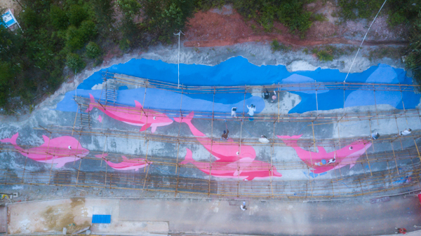 志愿者们在钦北区上勒岭钦江畔彩绘的《海豚嬉戏图》