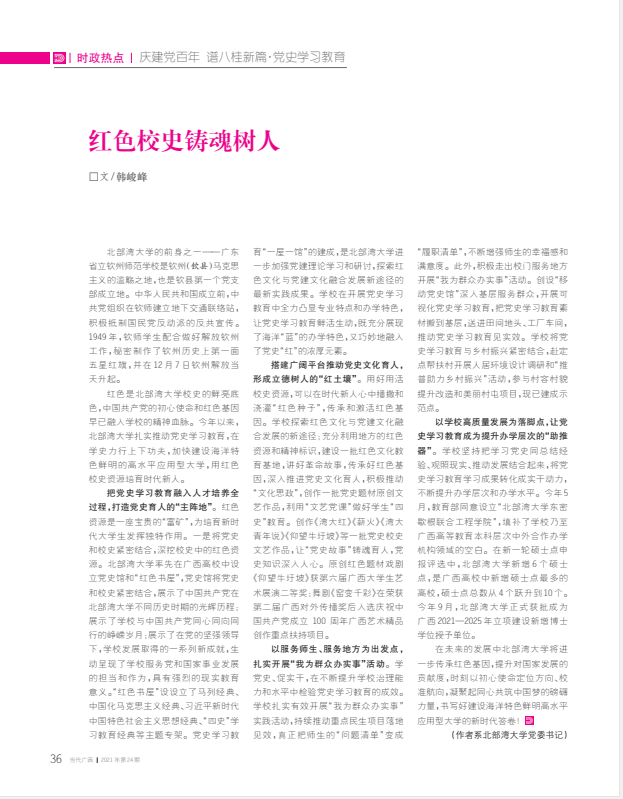 12月16日,《当代广西》杂志2021年第24期刊发pp电子党委书记韩峻峰理论文章《红色校史铸魂树人》。