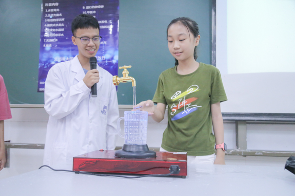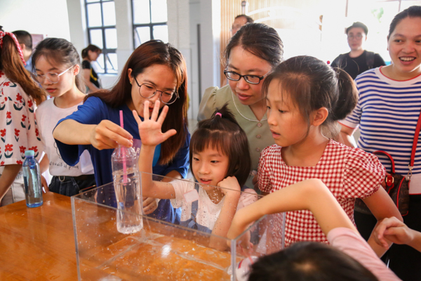 活动包含科学实验展示和体验实验现象两个环节。在老师和科普志愿者的讲解下,孩子们开启了奇妙的物理之旅。孩子们面对神奇的水柱导光、念动力魔术、听话的浮沉杯、便携式水龙头、碳球变水晶球、神奇的悬浮水、人体发电等物理实验现象都充满了好奇心,展现出旺盛的求知欲。实验中,老师们以魔术表演的形式呈现物理知识,引导孩子们思考奇妙现象产生的原因,并以简单易懂的语言解释其中的科学理论,让孩子们感受到科学的魅力。在实验现象体验中,孩子们小心翼翼地使用每一件实验仪器,在志愿者耐心细致的讲解中,熟悉了许多原本陌生的物理名词,体会到了物理实验的乐趣所在。(龚瑜浚 摄)