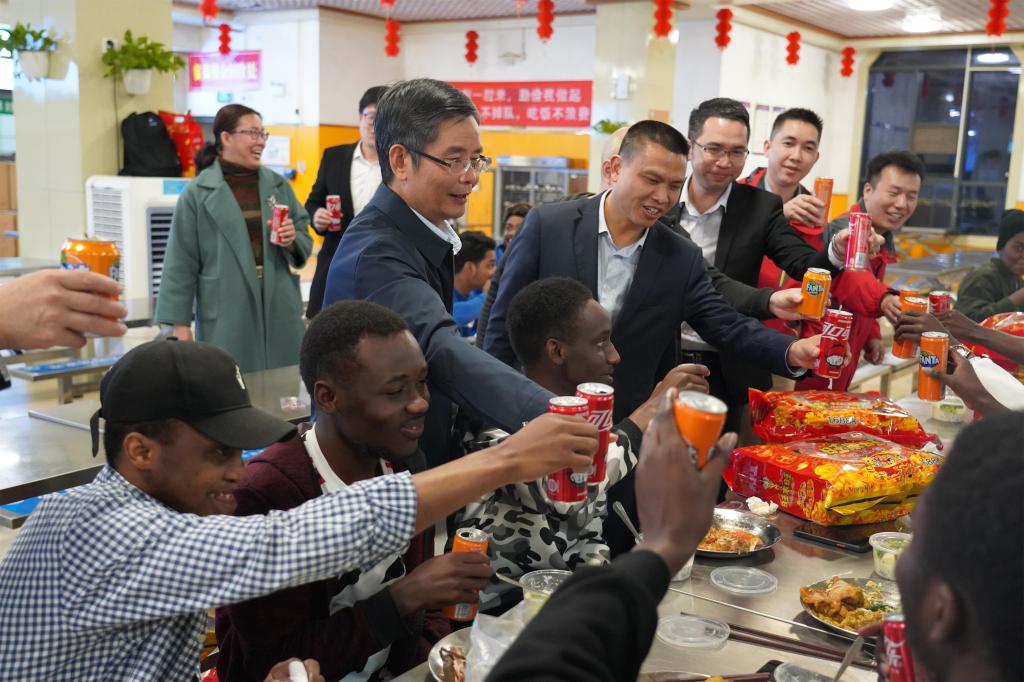北部湾畔植梁栋,新丝路上展雄姿。2月10日,年廿九,校园里处处挂满了红灯笼,洋溢着浓浓的年味儿。学校党委副书记陈锦山率队看望慰问寒假留校学生,在西区食堂与学生同吃年夜饭,共同迎接新春佳节。