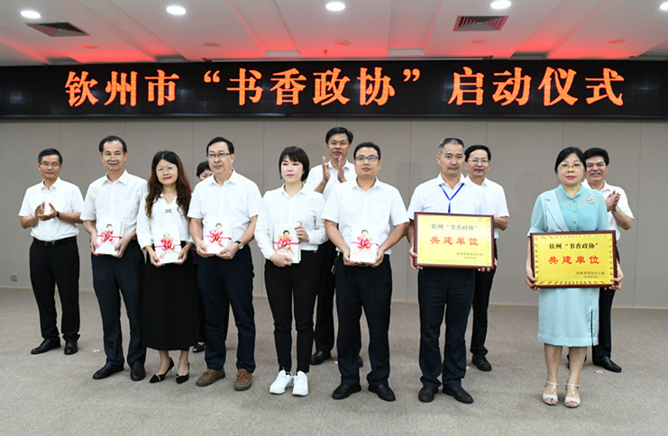 启动仪式上,陈锦山副书记与市委领导向政协委员代表赠书。市政协主席吕洪安、党组副书记陆明向pp电子图书馆、钦州市图书馆授予“钦州‘书香政协’共建单位”牌匾。