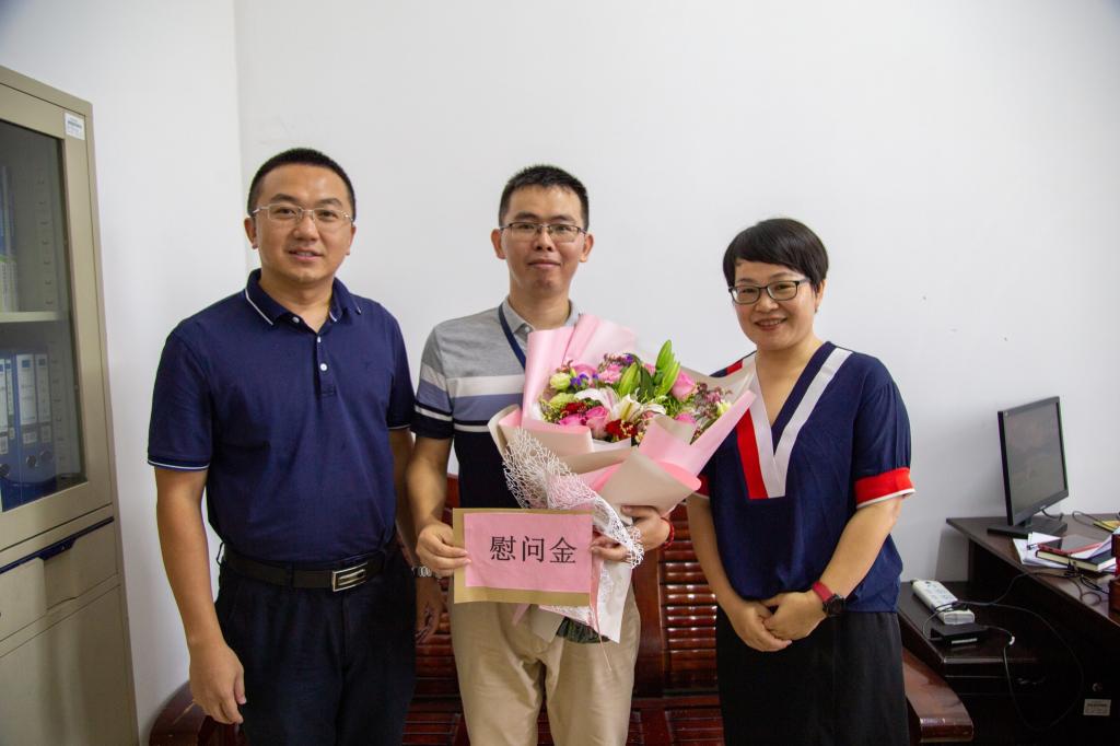 副校长陈磊(左一)慰问经济管理学院朱念老师(中)