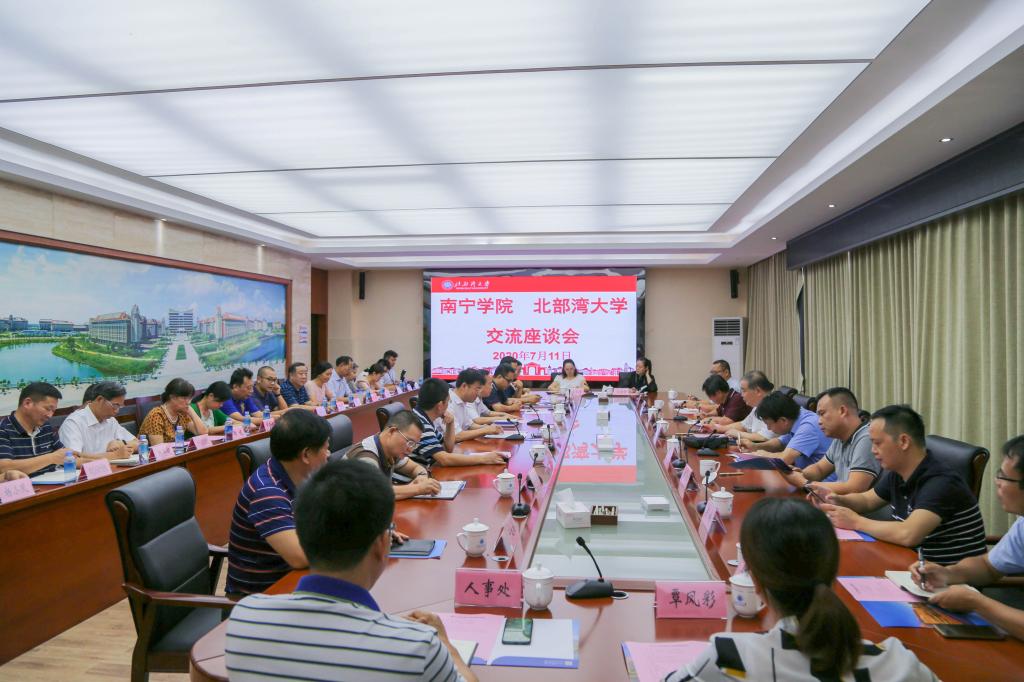 7月11日下午,南宁学院校长赖每,纪委书记覃存民,副校长李陶深、龚击等一行23人到pp电子就高校转型发展问题进行交流探讨。下午四时,双方在办公楼523会议室进行交流座谈。会议由学校副校长黄鹄主持。