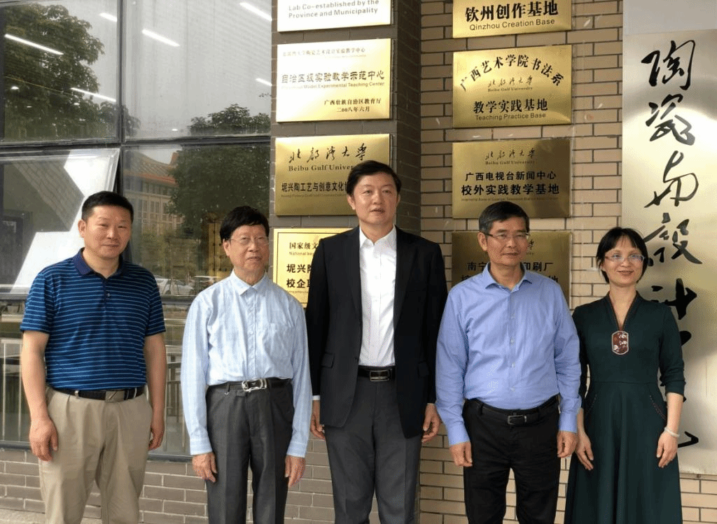 合影留念(左起陶瓷与设计学院院长周晓峰、工艺美术大师王兆儒、钦州市副市长卢峰、