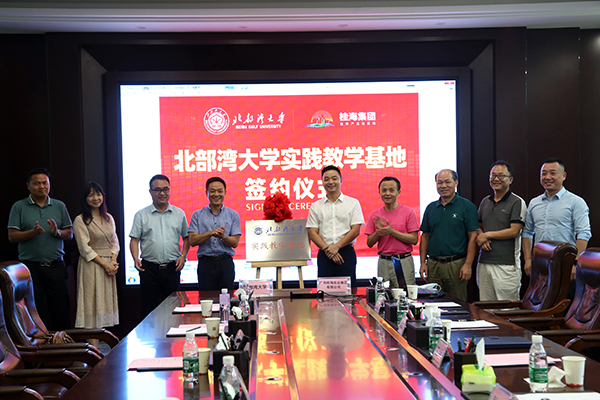 人文学院院长莫华善和广西桂海实业集团总经理王余签署战略合作框架协议,陈湘如副书记和王余总经理为实践教学基地揭牌。