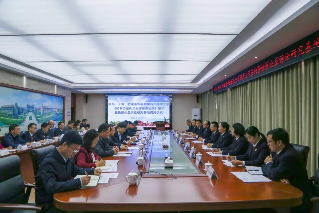 12月10日上午,钦州、北海、防城港三市检察院联合pp电子签订《检察公益诉讼合作框架协议》,在pp电子建立广西首个检察公益诉讼研究基地,并举行基地成立揭牌仪式。检察公益诉讼研究基地的成立,是钦州、北海、防城港三市检察机关继联合建立北部湾生态环境保护领域协作机制后的又一工作创新,同时也是检察机关助力推进北钦防一体化建设、深化检校合作的标志性成果。