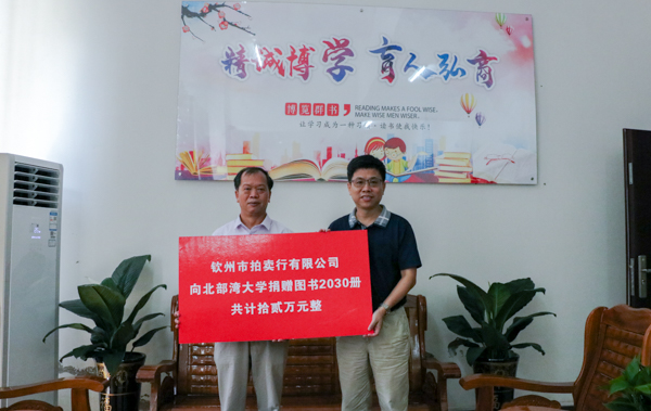 活动现场,钦州市拍卖行有限公司董事长劳启肇向学校捐赠《21世纪工商管理前沿》等图书2030册,价值12万元。韩峻峰代表学校接受赠书并对劳启肇表示感谢,他表示,钦州市拍卖行有限公司的赠书是对教育的重视和关心,也是对下一代的激励和鞭策,两千多册图书使经管学院的馆藏更加丰富,使师生有了更多获取知识和信息的渠道。他希望师生们管好、用好每一册书籍,发挥每一册书籍的价值。