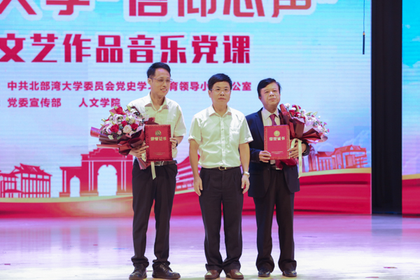 音乐党课上,学校校领导为原创者们送上了鲜花并颁发证书。