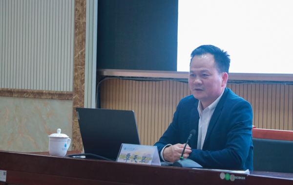 在学校12栋204报告厅,覃天卫主任用通俗易懂的语言和图文并茂的形式为大家讲解村标墙设立、村道处理、村文化活动集体设施修建、微型景观打造、垃圾污水处理、沟渠整治等实践实战案例,介绍钦州市“低成本、有产业、能保持、可推广”的乡村振兴工作中美丽村屯建设的模式。